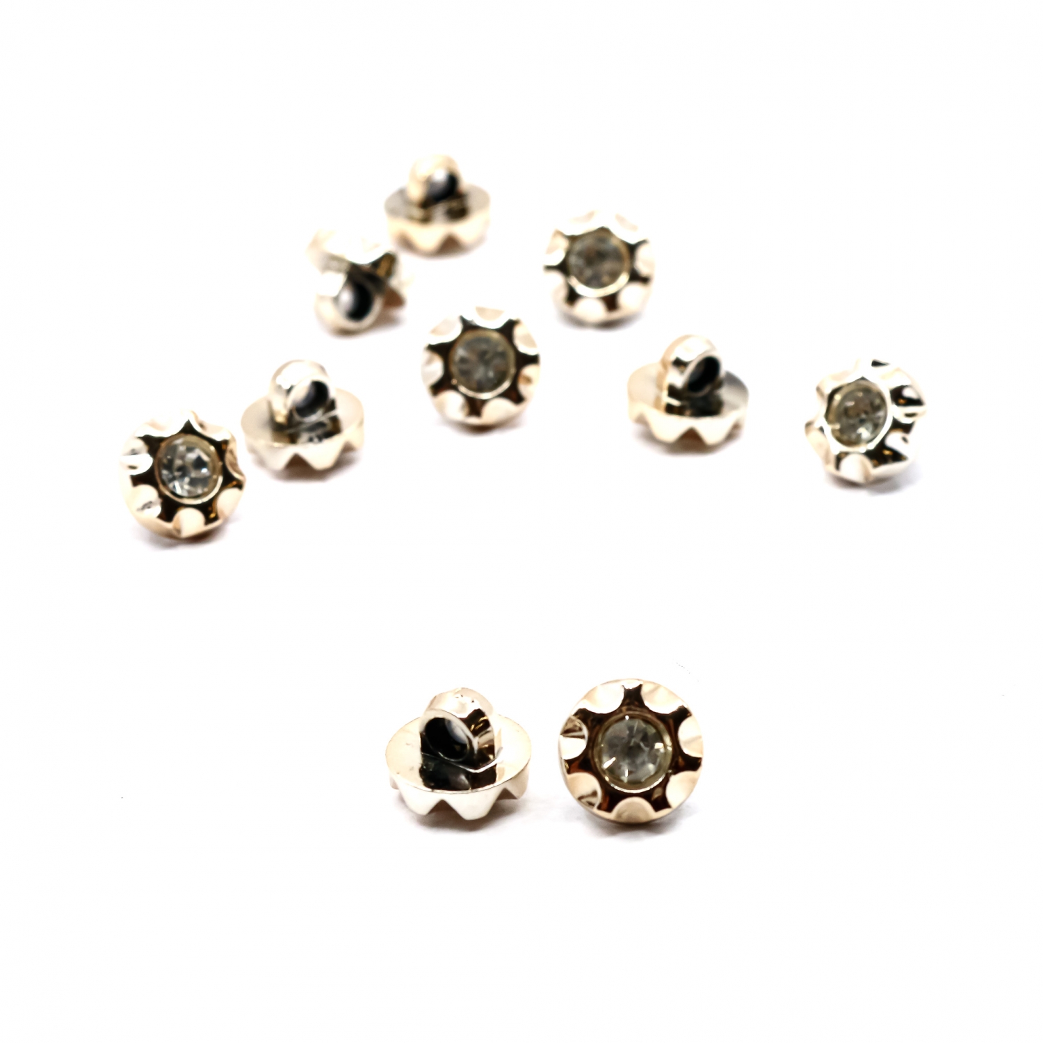 Nasturi metalizati cu picior decorati cu strasuri. Pretul afisat este pretul/pachet.